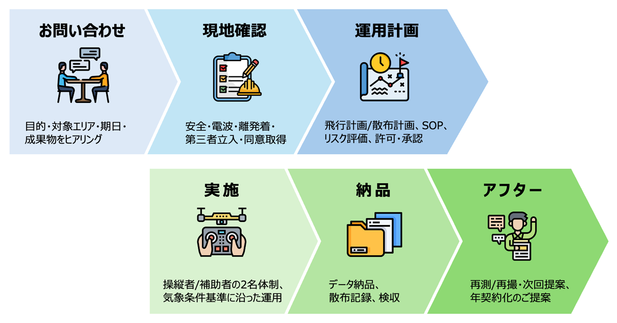 - 空撮→散布→環境調査→編集/解析まで一貫対応